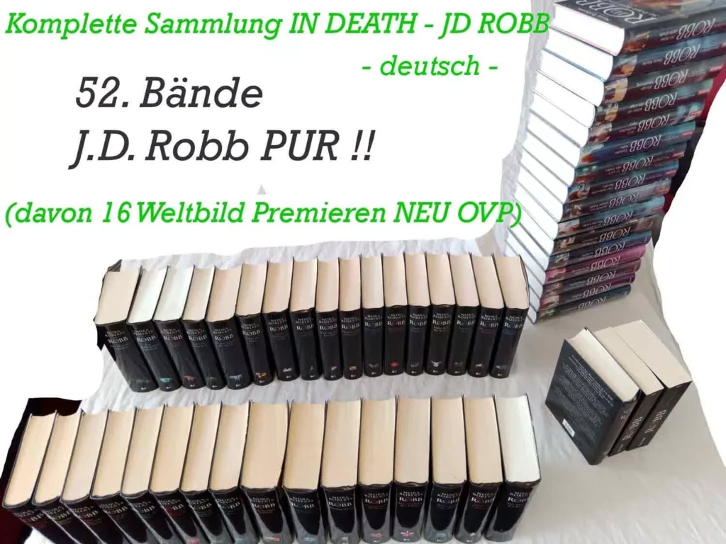 Eine einmalige Gelegenheit für Krimifans und Sammler der beliebten „In Death“-Reihe von J.D. Robb (Nora Roberts): Ich biete meine sorgfältig zusammengestellte Sammlung von insgesamt 52 Büchern an – alle Bände, die bisher (Stand 20.03.2025) auf Deutsch erschienen sind, inklusive Sonderausgaben und Kurzgeschichten.